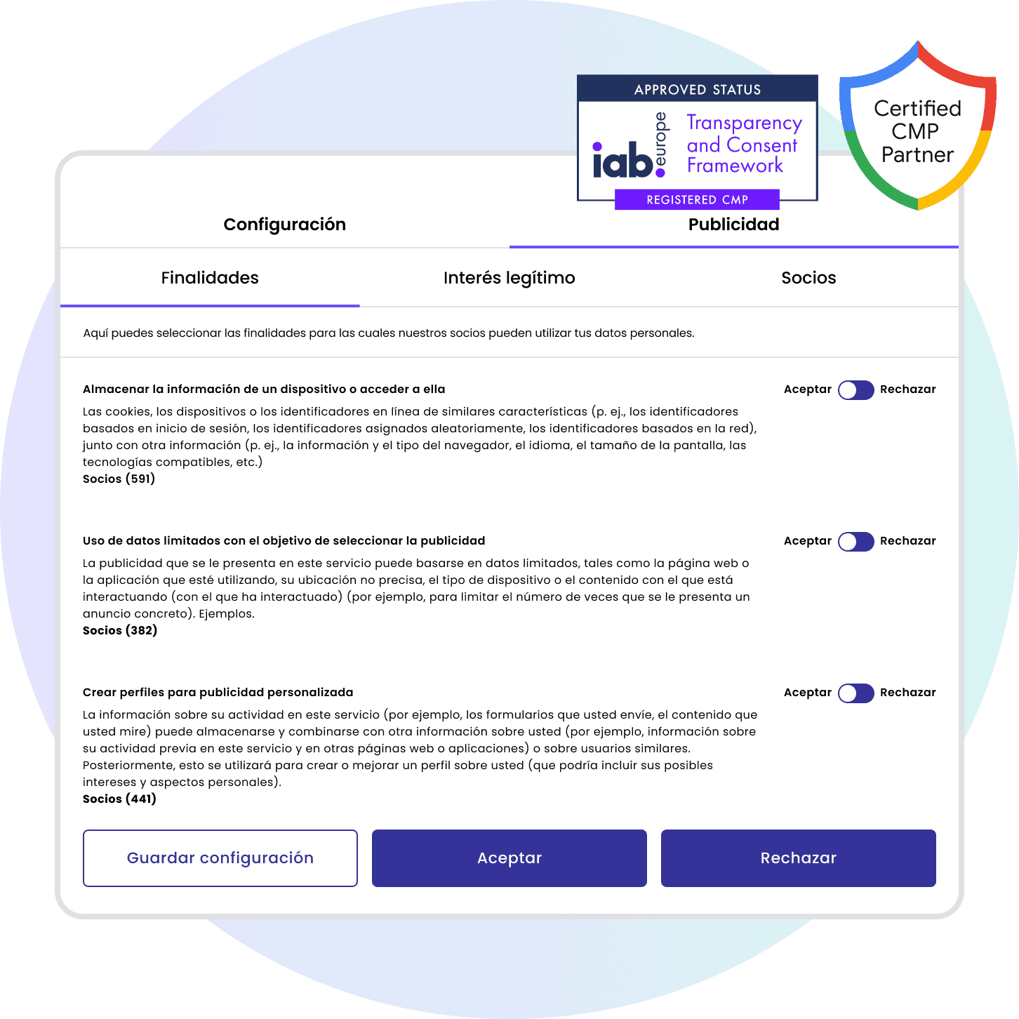 Nuestra solución proporciona un banner de consentimiento intuitivo y adaptable que informa claramente sobre el uso de cookies y permite a los usuarios controlar sus preferencias de datos. Esto no solo fomenta la transparencia y genera confianza, sino que también permite a tus usuarios tomar decisiones informadas. Además, el banner se actualiza automáticamente para adaptarse a las cookies de los anunciantes activos, sin necesidad de ajustes manuales.