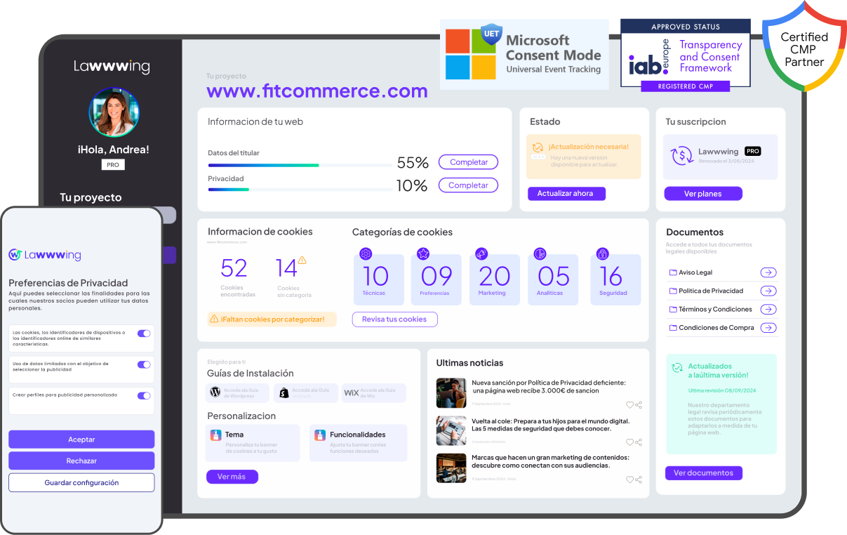 Como Google CMP Partner, Lawwwing incluye Google Consent Mode v2 en todos sus planes, el Plan Profesional incorpora la compatibilidad con el IAB TCF v2.2 para gestionar consentimientos publicitarios avanzados.